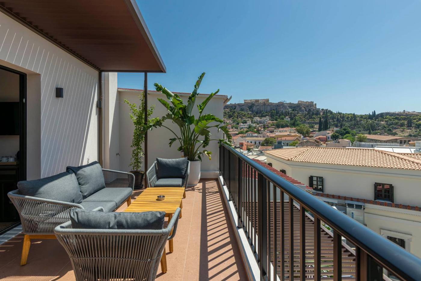 Deluxe Queen Room with Acropolis View Balcony. The double room provides air conditioning, soundproof walls, a terrace with city views as well as a private bathroom featuring a shower. The unit offers 1 bed. ;