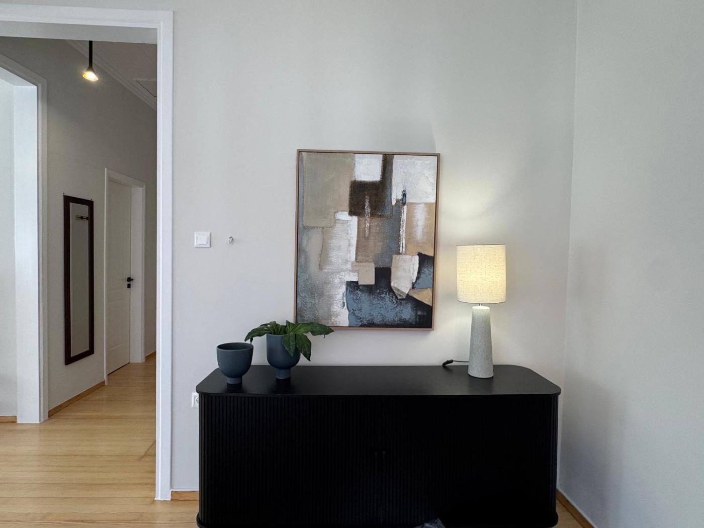 Two-Bedroom Apartment. Boasting a private entrance, this air-conditioned apartment features 1 living room, 2 separate bedrooms and 1 bathroom with a walk-in shower and a bath. In the well-equipped kitchen, guests will find a stovetop, a refrigerator, kitchenware and an oven. The spacious apartment features a washing machine, a tea and coffee maker, a seating area as well as a terrace with sea views. The unit has 4 beds.